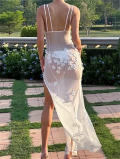 Sheer mesh, decorative flowers, deep v neck, ankle length, side slits, casual sleeveless beach dress, slim fit design easy to show your charming curves, keeping you comfortable all day.