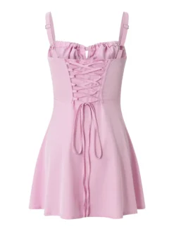 Women Summer Casual Sling Dress Solid Color Tie-Up Fishbone Waist Shaping Sleeveless Backless Short Dress Fashion Party Dress