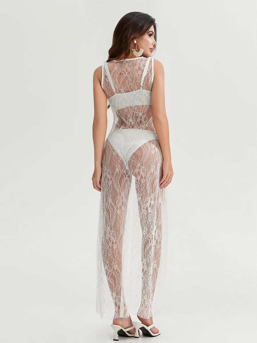 Women’s Lace Long Dress Vintage Sleeveless Deep V Neck Solid Color Bodycon Dress See-Through Dress